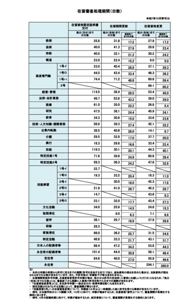 各種在留資格の新規の申請、変更申請、更新申請について、全国の出入国在留管理局平均の審査期間は以下のようになります。